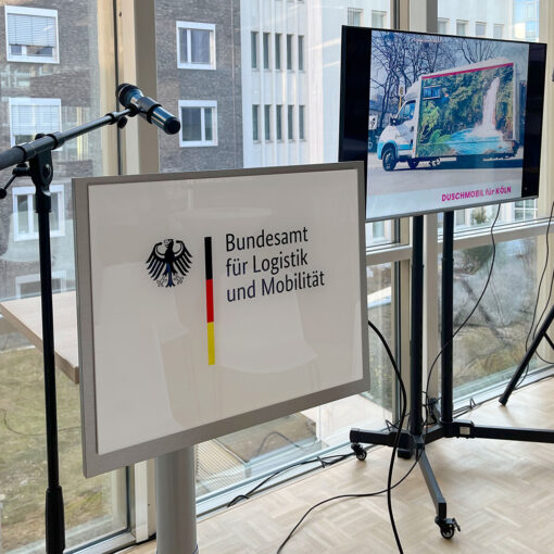 Präsentation beim Bundesamt für Logistik und Mobilität, das eine Spendenaktion für das Duschmobil für obdachlose Frauen in Köln ins Leben rief – mit Initiatorin Steffi Galli.